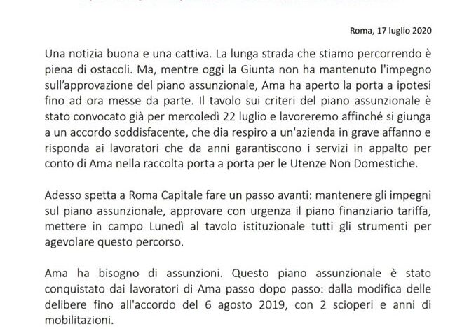 Comunicato dei sindacati ai lavoratori:“Roma Capitale non mantiene gli impegni, passo avanti con Ama, Apertura dopo l’occupazione della sede di…