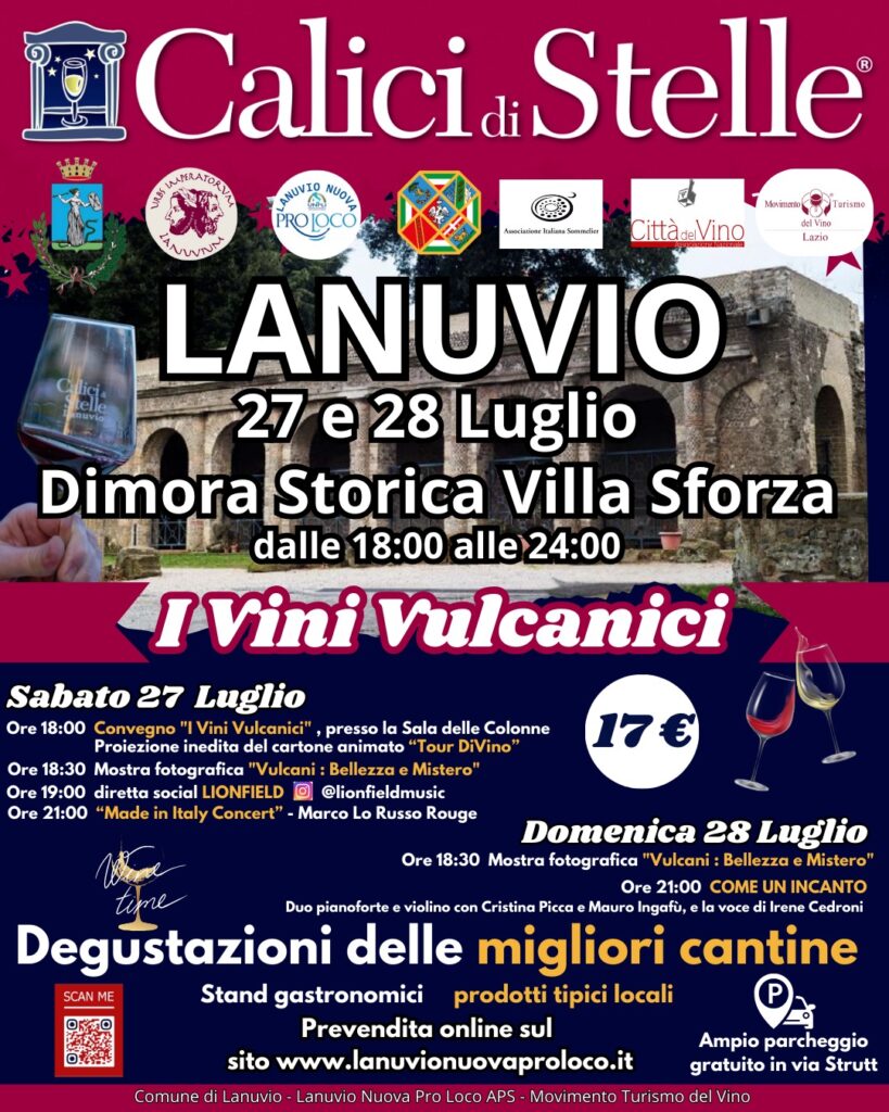 Calici di Stelle, promossa dall’Associazione Città del Vino, torna a Lanuvio con la sua terza edizione: Sabato 27 e Domenica 28 Luglio, dalle 18 alle 24, presso la dimora storica di Villa Sforza Cesarini, via Sforza Cesarini 27, si terrà la manifestazione sostenuta dal Movimento Turismo del Vino. L’iniziativa, organizzata dal Comune di Lanuvio e dalla Lanuvio Nuova Pro Loco APS, mira alla valorizzazione e alla divulgazione delle ricchezze della produzione vinicola locale, sottolineando con il tema de “I Vini Vulcanici” l’origine della ricchezza del territorio dei Colli Lanuvini.