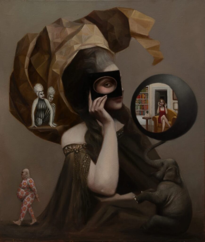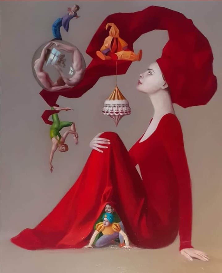 Sono scenari di suggestivi ambienti barocchi in cui si respira l’eleganza di certe atmosfere di vita quotidiana di nobildonne, aristocratiche e cortigiane, sorprese nell’intimità di un gesto o di una movenza, in cui viene enfatizzata la femminilità come un vezzo insinuante e provocatorio. Ad aumentarne l’effetto impattante compete l’accostamento di oggetti e dettagli simbolici dei personaggi impegnati in qualche strana piroetta o arrampicata circense, dipinti in abiti d’epoca e coloratissimi, di quelle cromie accese, vivide e ostentate, come un’anomalia o come un’attitudine.