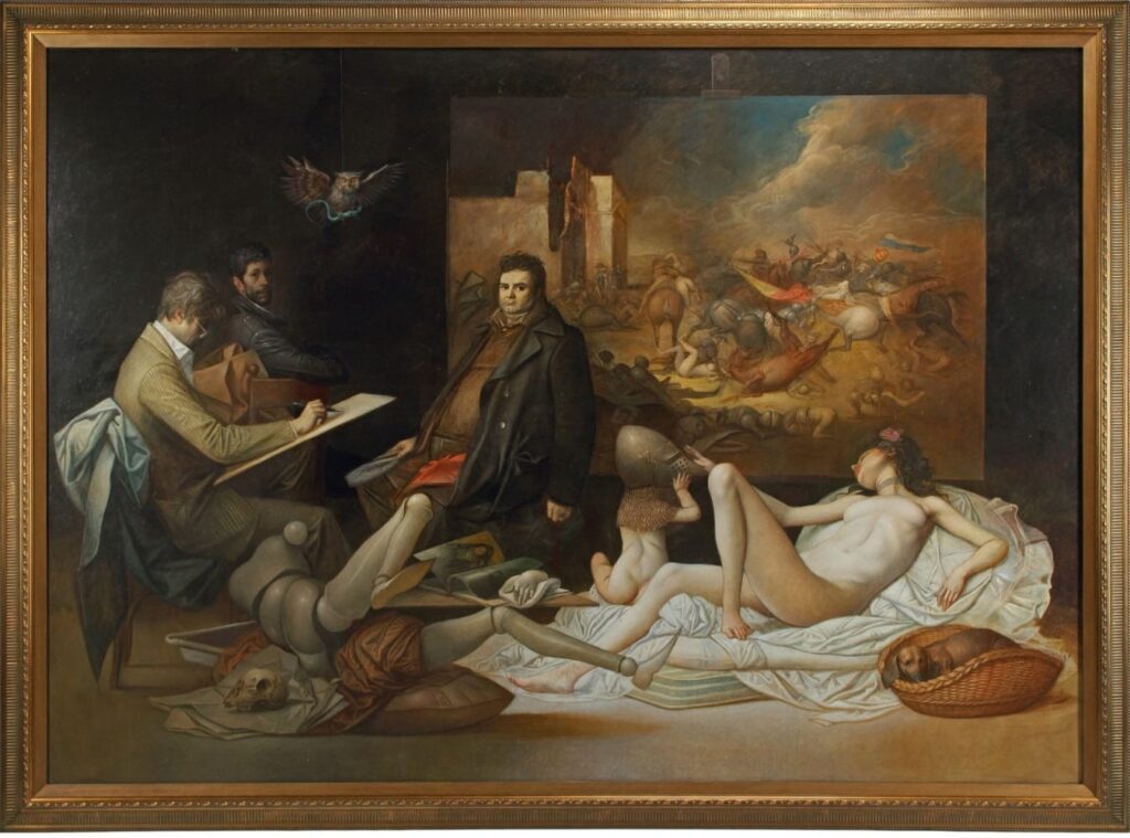 spazio di grandi atelier di pittura e scultura, ove qualcuno dipinge o si lascia ritrarre, altri assistono senza interferire.