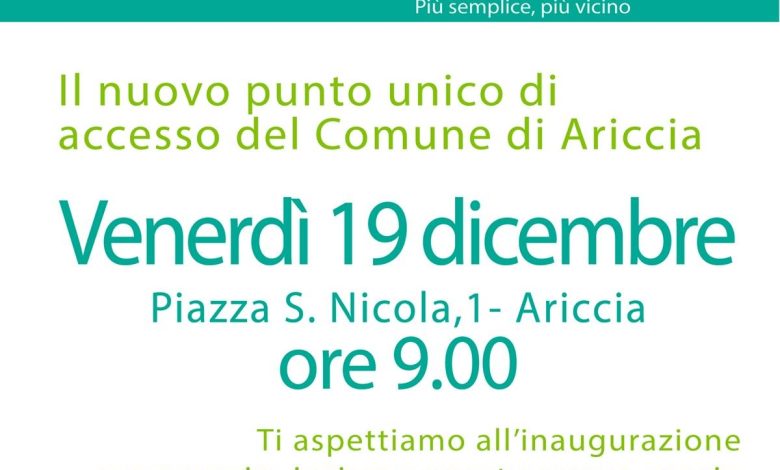 Il Comune di Ariccia, venerdì 19 dicembre in piazza San Nicola alle ore 9.00, è pronto a inaugurare Punto Comune, un nuovo servizio pensato per rendere più semplice, immediato ed efficace il rapporto tra cittadini e Amministrazione. Punto Comune è uno sportello unico evoluto, parte integrante delle Linee di Mandato ARICCIA – Città dell’innovazione e del digitale, che punta a migliorare la qualità dei servizi erogati, a semplificare i processi amministrativi e a garantire un accesso integrato sia fisico sia digitale ai principali servizi comunali.