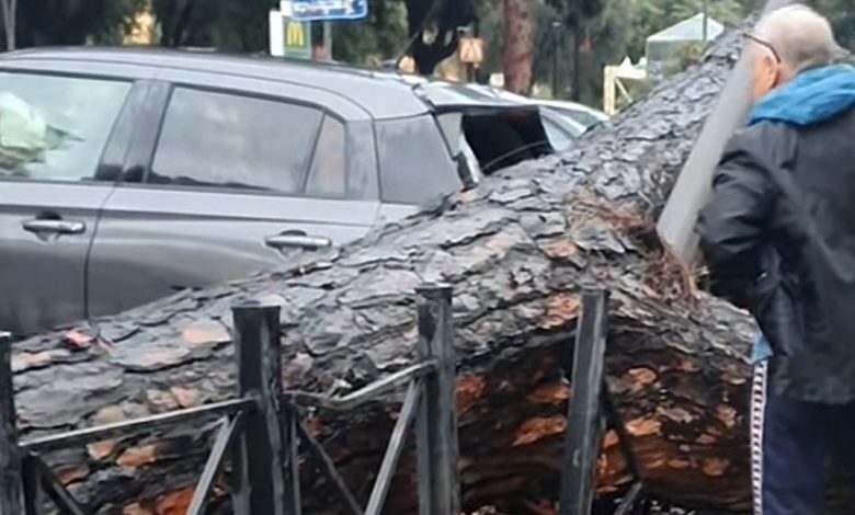 Isola Tiberina con il fiume al limite dell’esondazione (entro gli argini, per ora), nel quartiere Re di Roma un albero…