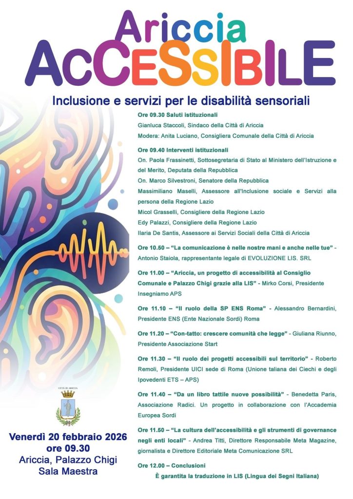 “Ariccia accessibile: inclusione e servizi per le disabilità sensoriali” è il titolo del convegno organizzato dalla Città di Ariccia per il prossimo venerdì 20 febbraio presso la Sala Maestra di Palazzo Chigi, alle ore 9:30. L’evento rappresenterà un importante momento di dialogo sui temi dell’accessibilità dei servizi pubblici, con particolare attenzione alle esigenze delle persone con disabilità sensoriali. Tanti gli interventi istituzionali di rilievo a cui seguiranno le parole di chi, sul territorio ariccino, sta portando avanti progetti concreti a favore dell’accessibilità. Parteciperanno associazioni rappresentative delle persone sorde e delle persone non vedenti, che illustreranno testimonianze, esperienze e proposte.