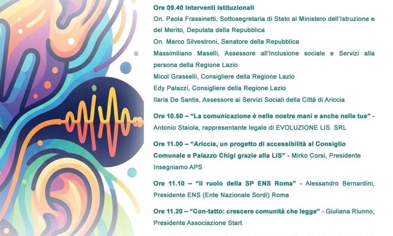 Il convegno sarà infatti l’occasione per raccontare i progetti che la Città di Ariccia da tempo sta portando avanti, come il progetto “Con-tatto: per leggere insieme”, realizzato in collaborazione con l’associazione Start sin dal 2021. In partenza anche il progetto E-lisir che prevede l’attivazione di Postazioni Comunali di Accesso LIS, dotate di tablet con servizio di traduzione e interpretariato in Lingua Italiana dei Segni (LIS) da remoto. Tali strumenti consentono una comunicazione in tempo reale con operatori formati, superando le barriere legate alla comunicazione esclusivamente orale. Le Postazioni Comunali di Accesso LIS sono previste presso gli uffici della Casa comunale (Anagrafe, Tributi, Polizia Locale e Punto Comune), presso Palazzo Chigi e presso le farmacie comunali del territorio (Crocifisso e Spolverini).